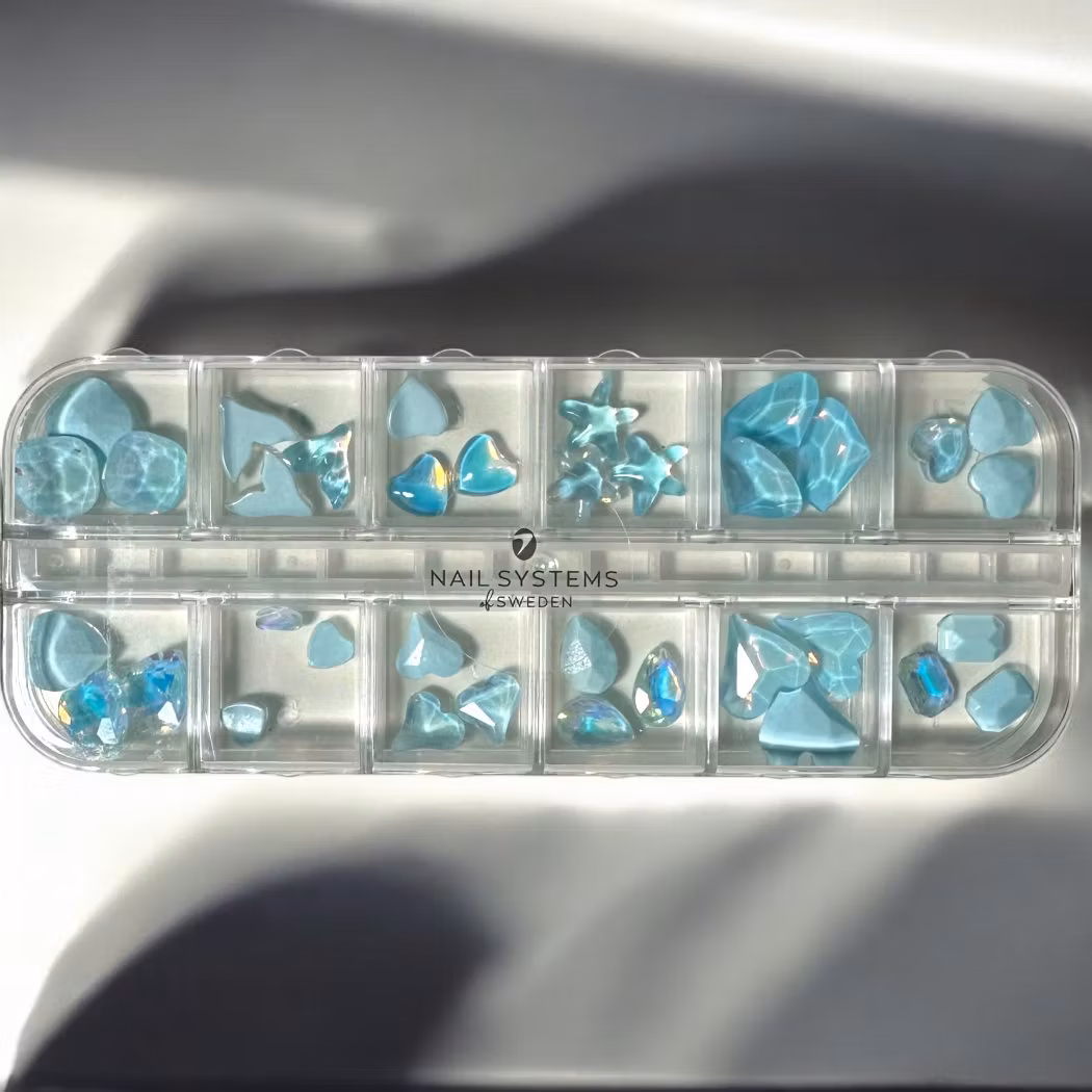 Crystal Shapes XL Blue Fantasy är en glittrande ask med 12 fack fyllda med olika former av blåa 3D-dekorationer. Du hittar bland annat hjärtan, sjöstjärnor, fyrkantiga "diamanter", droppar och mermaidfenor – tre av varje form. Alla dekorationer är större i storlek och passar perfekt när du vill skapa något extra på naglarna.