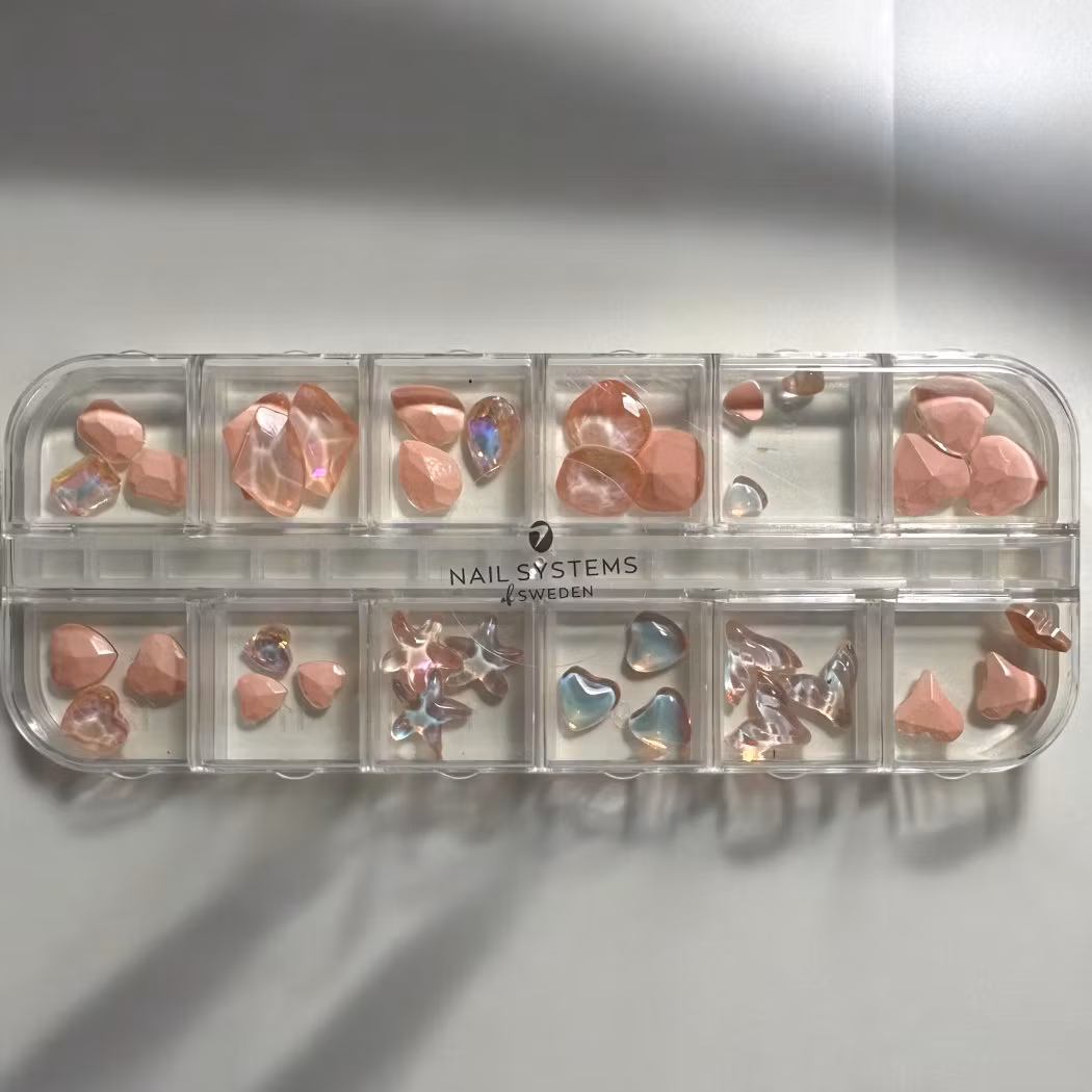 Crystal Shapes XL Orange Glow levererar en varm och skimrande känsla till din design. Asken innehåller 12 små fack med större 3D-dekorationer – allt från droppformade kristaller till stjärnor, hjärtan, fenor och fyrkantiga "diamanter". Tre av varje form gör det enkelt att skapa enhetliga eller mixade looks.