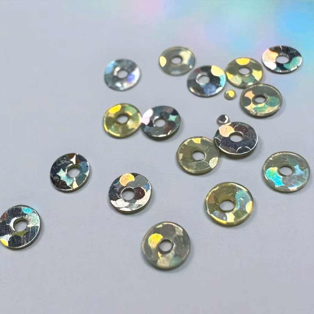 Paljetterna gnistrar i regnbågsskimmer tack vare sin holografiska yta och skapar direkt en festlig, futuristisk känsla. Applicera dem ovanpå färg eller bygg in i materialet för en mer inbäddad look.