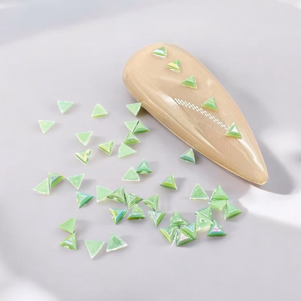 Med Pearl Green Triangles kan du ge dina naglar ett stilfullt och skimrande utseende. Dessa triangelformade gröna pärlor, cirka 45 st per påse, har en vacker pärlemorsfinish som reflekterar ljuset på ett subtilt och elegant sätt. Perfekta för att skapa unika och iögonfallande nageldesigner.