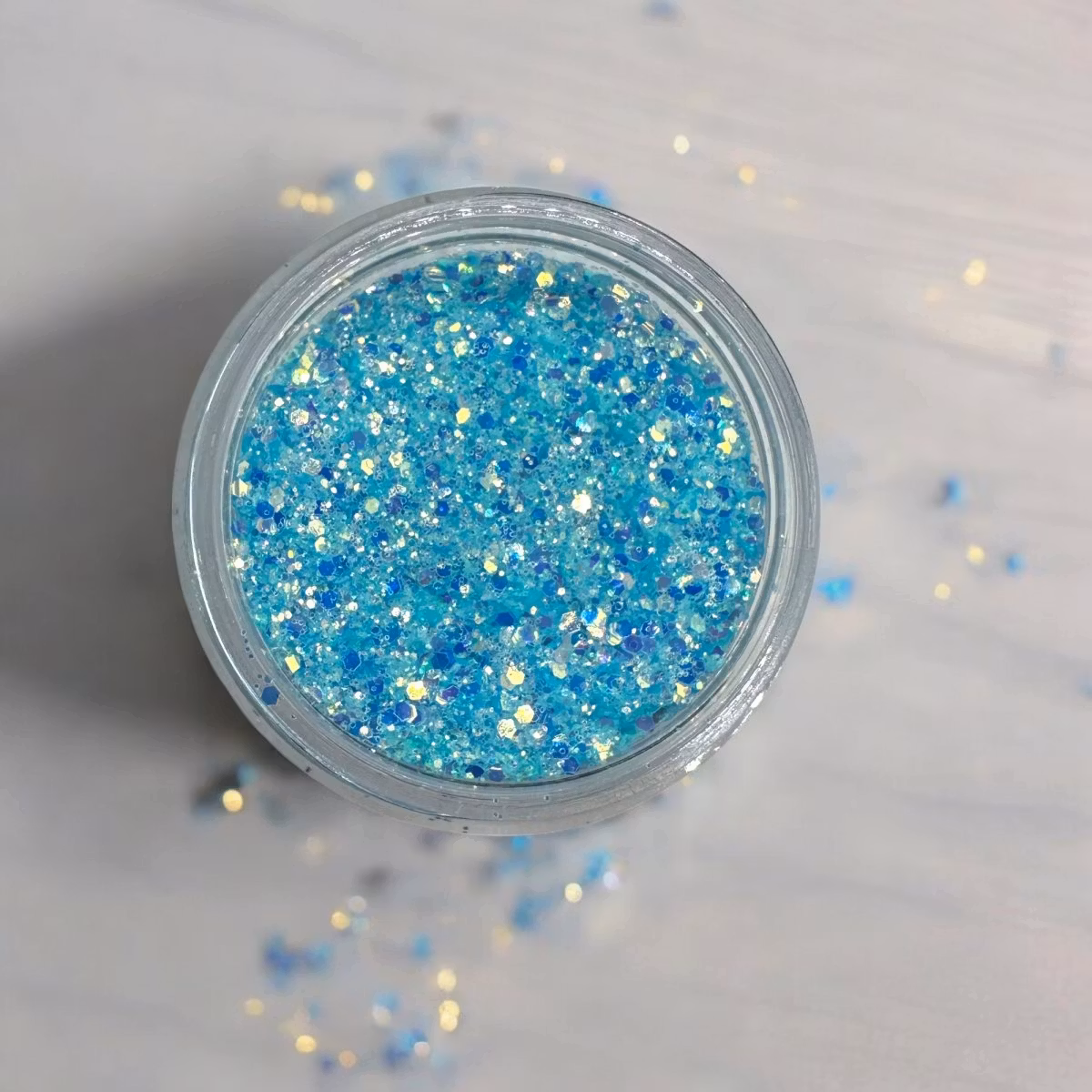 Blue Dusk är ett svalt och glittrande ljusblått glitter med en diskret touch av varma guldtoner. Det blå står i fokus, men det lilla guldskenet ger extra dimension och mjukhet. De mixade storlekarna ger ytan liv och skimmer utan att ta över.