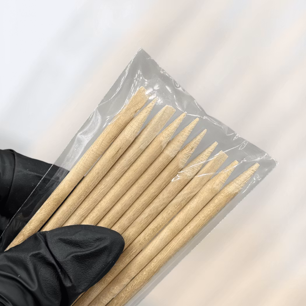 Orangepinne Lång - 10st är en klassisk och mångsidig produkt i salongen – med en spetsig ände på ena sidan och en rak på den andra. Den spetsiga sidan är perfekt för precisionsrengöring vid nagelband och sidor, medan den raka änden lämpar sig för att trycka tillbaka nagelband eller försiktigt justera material.