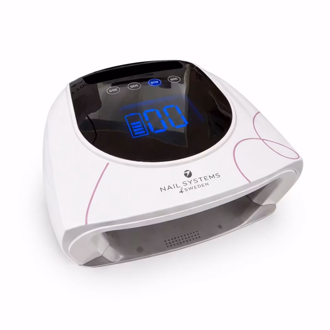 Med dubbel våglängd (365–405 nm) ger lampan jämn och säker härdning av Nail Systems gel, Acrygel samt gelpolish. Auto-sensor aktiverar lampan automatiskt när handen placeras i lampan, och de manuella timerlägena 30, 60, 90 och 99 sekunder ger full kontroll under behandlingen.